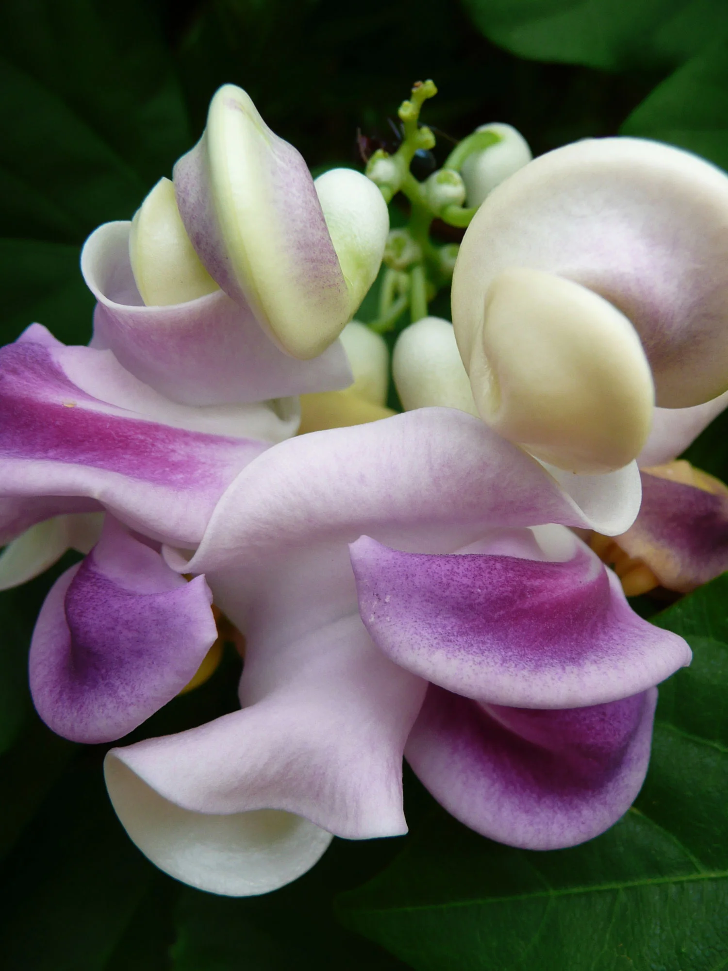 The flowers are a wondrous shape, curling about like snail shells, in beautiful pearly cream & stunning purple shades.