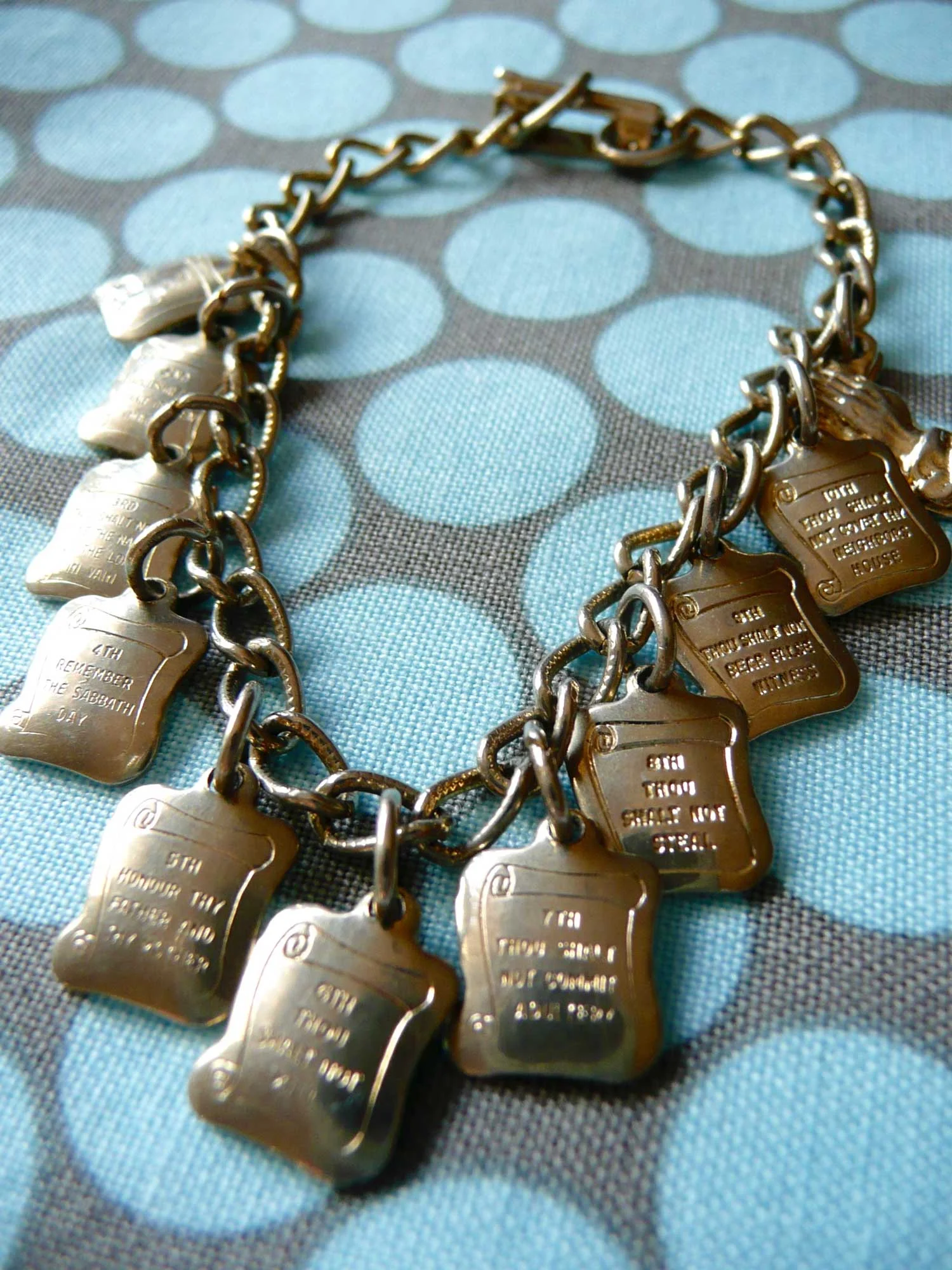 I found the little ten commandment charm bracelet I posted about yesterday - tiny, tiny writing that only a child's eyes could read: